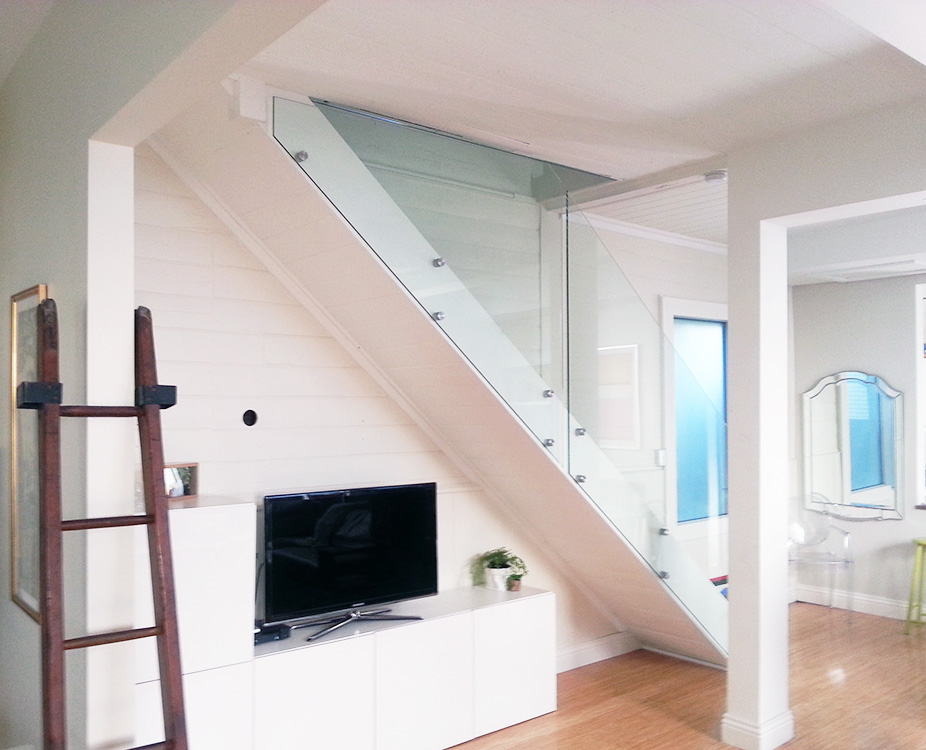 Home office handrail, designed and installed by Rozelle glass. Cut to size template 12mm toughen glass with chrome finish pins